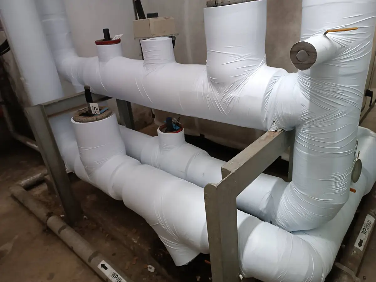 針對老舊設備及管線保溫材老化問題,本案進行全面汰舊換新作業,將原有破損、失效的保溫層拆除後,改用 Armacell Armaflex O級及PE非鹵素保溫材,提升防火與隔熱性能,並加強防潮層處理,延長設備使用壽命,整體施工效率高,讓客戶在最短時間內恢復系統最佳狀態。